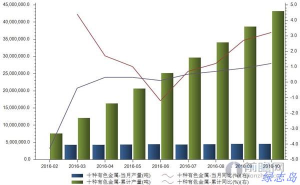 2016年10月十種有色金屬產(chǎn)量455萬噸,當月同比增長3.2%;1-10月累計產(chǎn)量4319萬噸,累計同比增長1.2%。